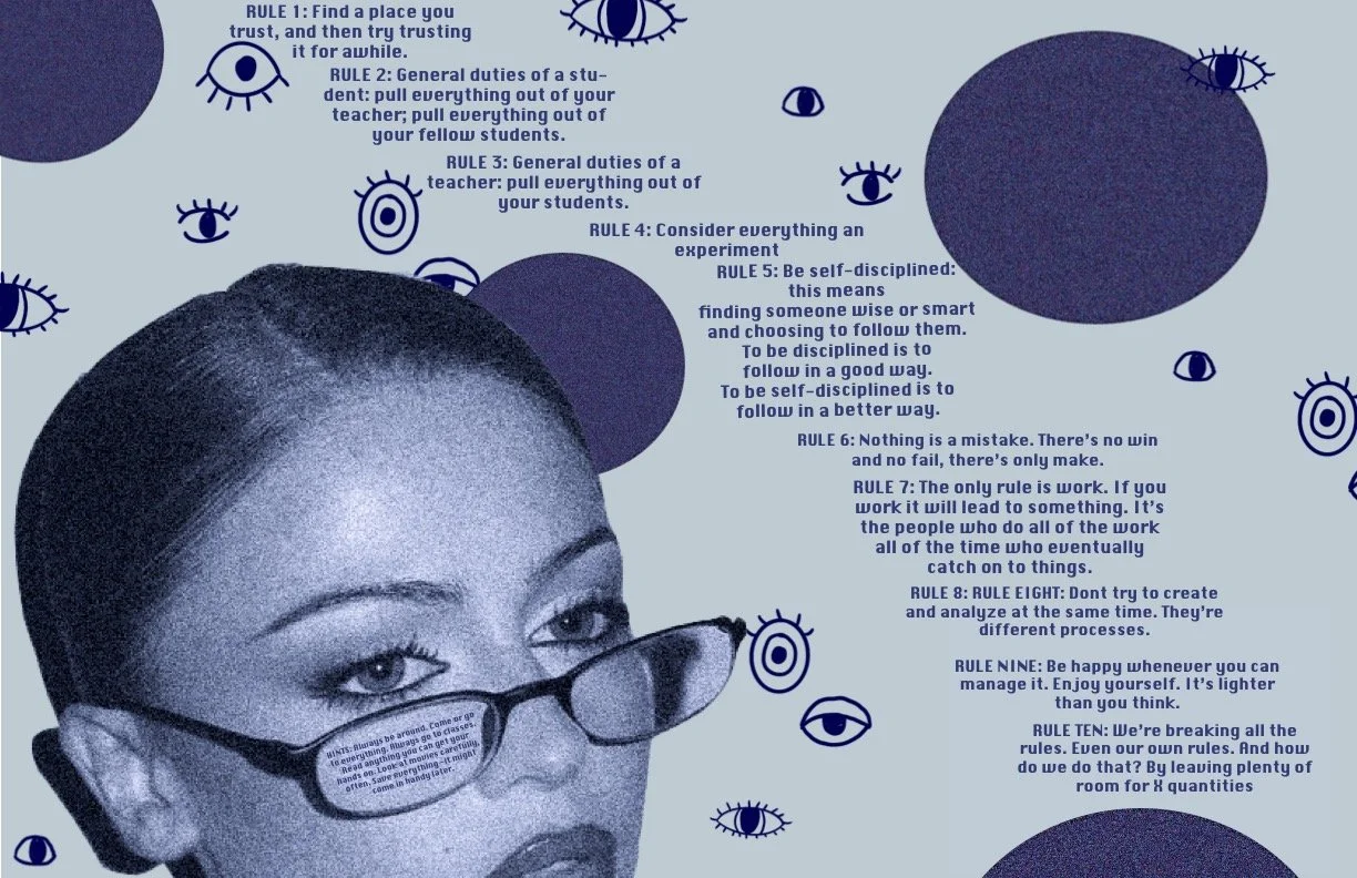 The third spread focuses on themes of observation. Repeated eye imagery symbolizes awareness, perception, and the act of truly seeing, reinforcing ideas of focus and self-guided discovery. A cool, muted color palette creates a calm, contemplative atmosphere, while soft circular forms help structure the layout without distracting from the text. Through restrained color, static composition, and carefully angled typography, this spread emphasizes discipline, curiosity, and experimentation, aligning with the reflective nature of the 10 Rules while presenting them in a more modern, conceptual aesthetic.
